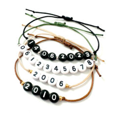 Dit armbandje met datum, jaartal of telefoonnummer is een leuk gepersonaliseerd cadeautje! Leuk voor mama of papa met geboortedatum van de kinderen. Handig armbandje voor kinderen met het telefoonnummer van papa of mama. Of als vriendschapsarmbandje met een speciale datum of geboortejaar. Draag het bijvoorbeeld als zussen armbandje, vriendinnen armbandje, armbandje voor vader en zoon / dochter, moeder en zoon/dochter armbandje, broer en zus of gewoon lekker voor jezelf! Kies uit witte kralen met zwarte cijfers, of zwarte kralen met witte cijfers. In plaats van cijfers is het ook mogelijk om letters te kiezen. Kies daarna de kleur van het bandje en ga voor een afwerking met stainless steel kraaltjes of silver / gold plated stainless steel kraaltjes.Wil je extra zilver of goud stainless steel kraaltjes of een knoopje tussen de getallen?