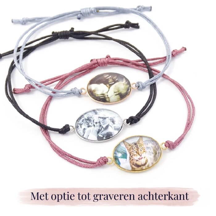 Het foto armbandje wordt afgewerkt met een geknoopt armbandje van zacht koord